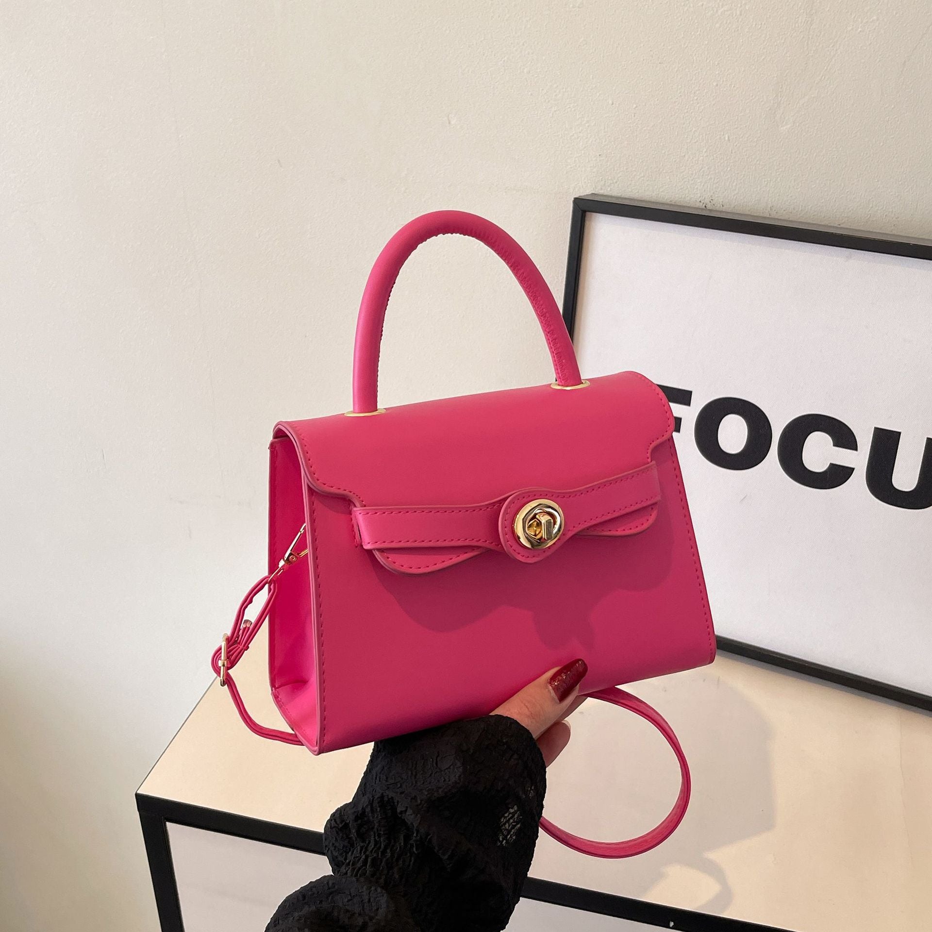 Maak je outfit compleet met de charmante Sophie. Deze compacte handtas is dé perfecte accessoire voor zowel een chique diner als een dagje shoppen. Het gestructureerde ontwerp en de goudkleurige draaisluiting geven de tas een luxe uitstraling die direct in het oog springt. Draag hem elegant in de hand aan het stevige handvat, of klik de riem vast om hem comfortabel over je schouder te dragen.